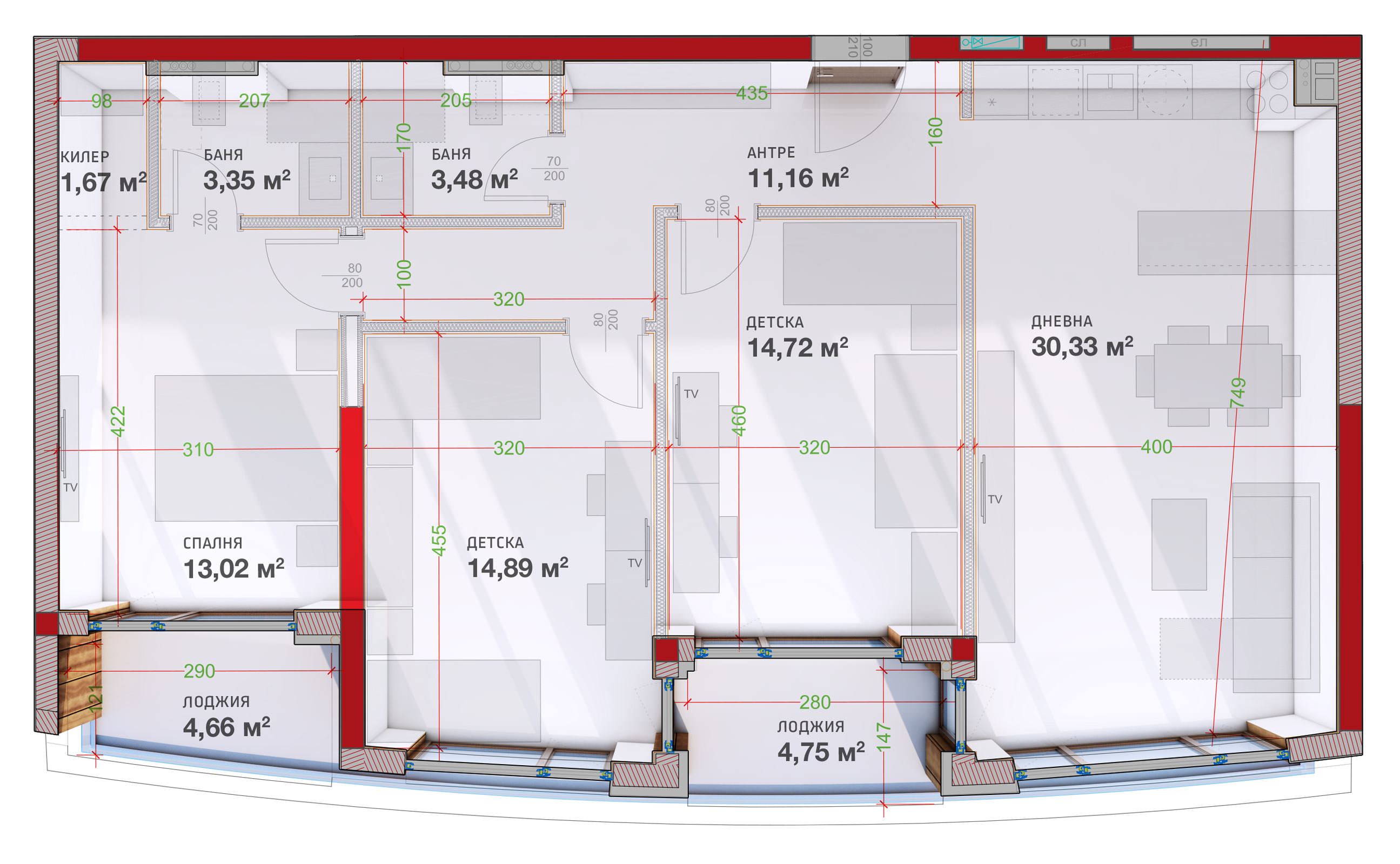 Голяма дневна с кухненски бокс — 30,33 м2. спалня с площ — 13,02 м2 и самостоятелна баня към нея — 3,35 м2. килер — 1,67 м2 и уединена лоджия — 4,66 м2 ; две просторни детски стаи с площ 14,72 м2 и 14,89 м2. антре — 11,16 м2. баня —3,48 м2 и втора лоджия с достъп от дневната и двете детски стаи с площ — 4,75 м2 ,