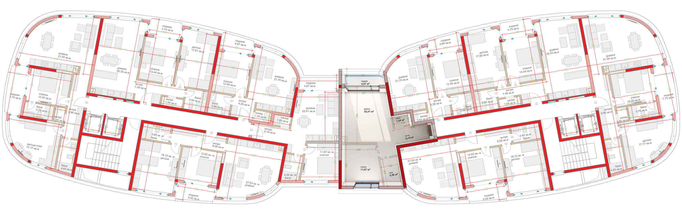 Функционална дневна с кухненски бокс с площ 22,41 м2. спалня — 11,87 м2 , антре — 5,19 м2 , баня — 4,00 м2 , удобен килер — 1,54 м2 , лоджия — 4,67 м2 ,