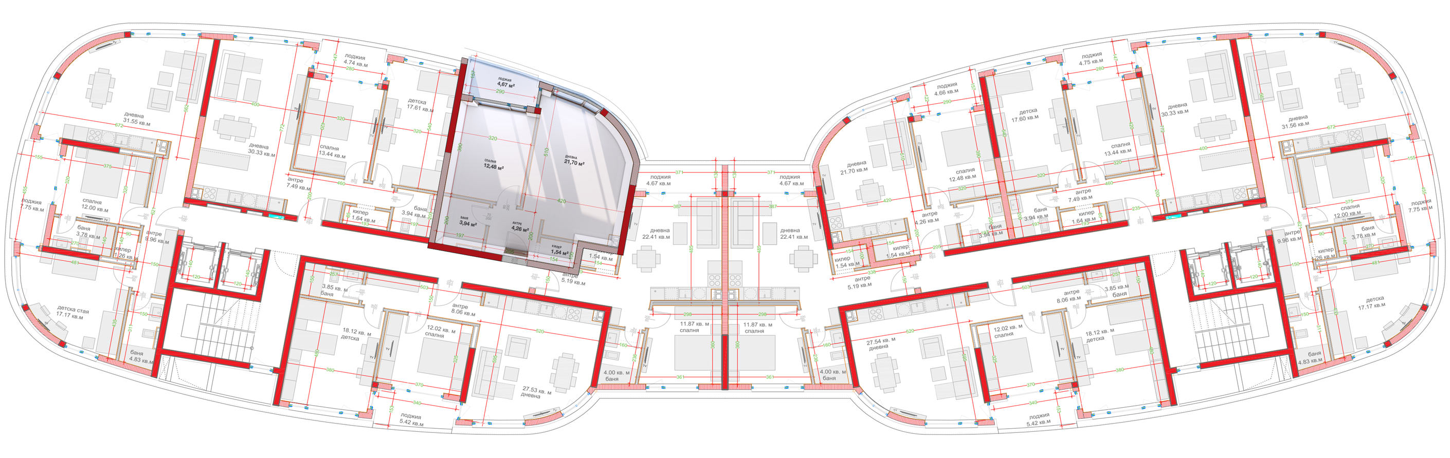 Комфортна дневна с кухненски бокс с площ 21,70 м2. спалня — 12,48 м2. антре — 4,26 м2. баня — 3,94 м2 , удобен килер — 1,54 м2 , лоджия — 4,67 м2