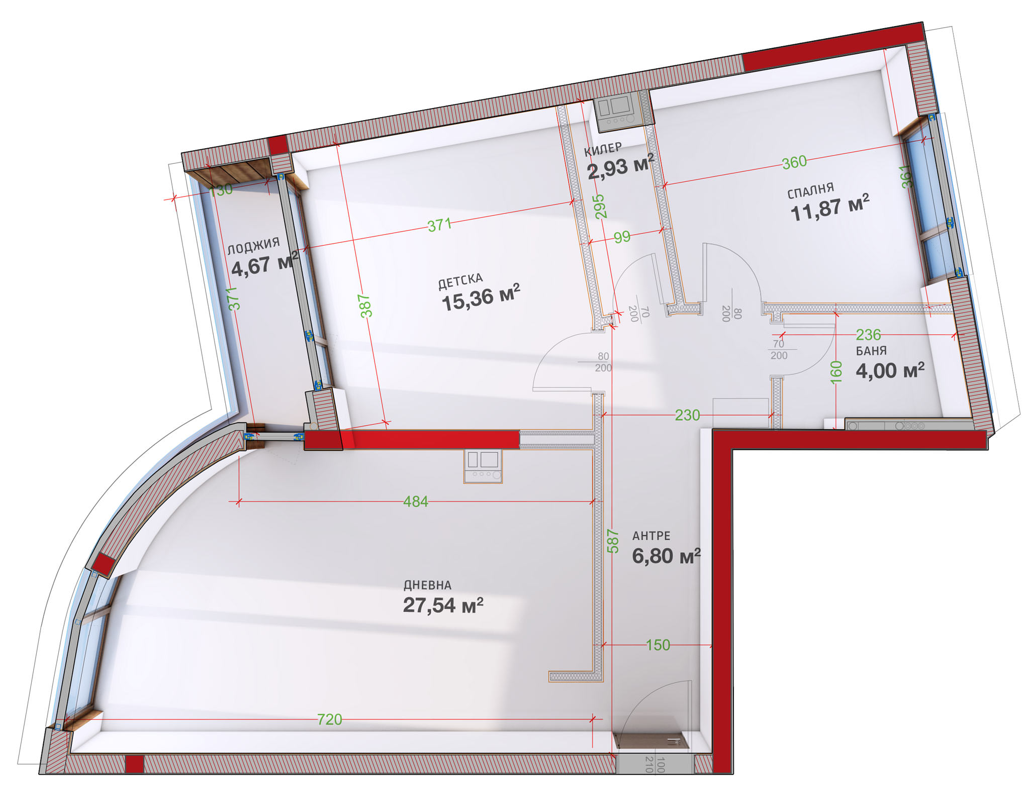 Просторна дневна с кухненски бокс с площ — 27,54 м2. спалня — 11,87 м2 ,голяма детска стая — 15,36 м2. удобен килер — 2,93 м2. антре — 6,80 м2. баня — 4,00 м2 и лоджия — 4,67 м2 ,